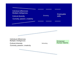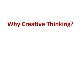 This document discusses fostering creative thinking through classroom activities. It provides examples of talks and research that emphasize the importance of creativity in education. Activities are suggested to help students think creatively, such as having them draw their classroom from different perspectives, create stories from pictures, and explore alternative meanings and contexts for phrases. The conclusion emphasizes that creativity involves thinking without limitations.