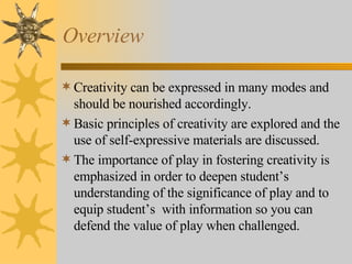 This document discusses fostering creativity in children through curriculum. It emphasizes that creativity can be expressed in many ways and should be nourished accordingly. The importance of play in developing creativity is highlighted. Theories of art development and factors that influence creativity are also examined.