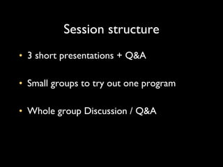 The document discusses a session focusing on engaging visitors in science, art, and children's museums through inquiry-based learning. It presents findings from research on visitor inquiry skills at exhibits, highlighting the effectiveness of a 'juicy question' format in promoting collaboration and deeper understanding. The session included presentations and group activities aimed at improving inquiry skills among visitors, particularly families and field trip groups.