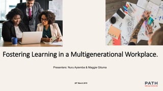 The document discusses fostering learning in a multigenerational workplace, emphasizing the importance of continuous learning and acknowledging the presence of multiple generations such as Generation X and Millennials. It highlights issues like generational stereotypes, cultural differences in learning, and the need for diverse feedback methods. Strategies for effectively managing and leveraging these differences to enhance productivity and collaboration are also explored.