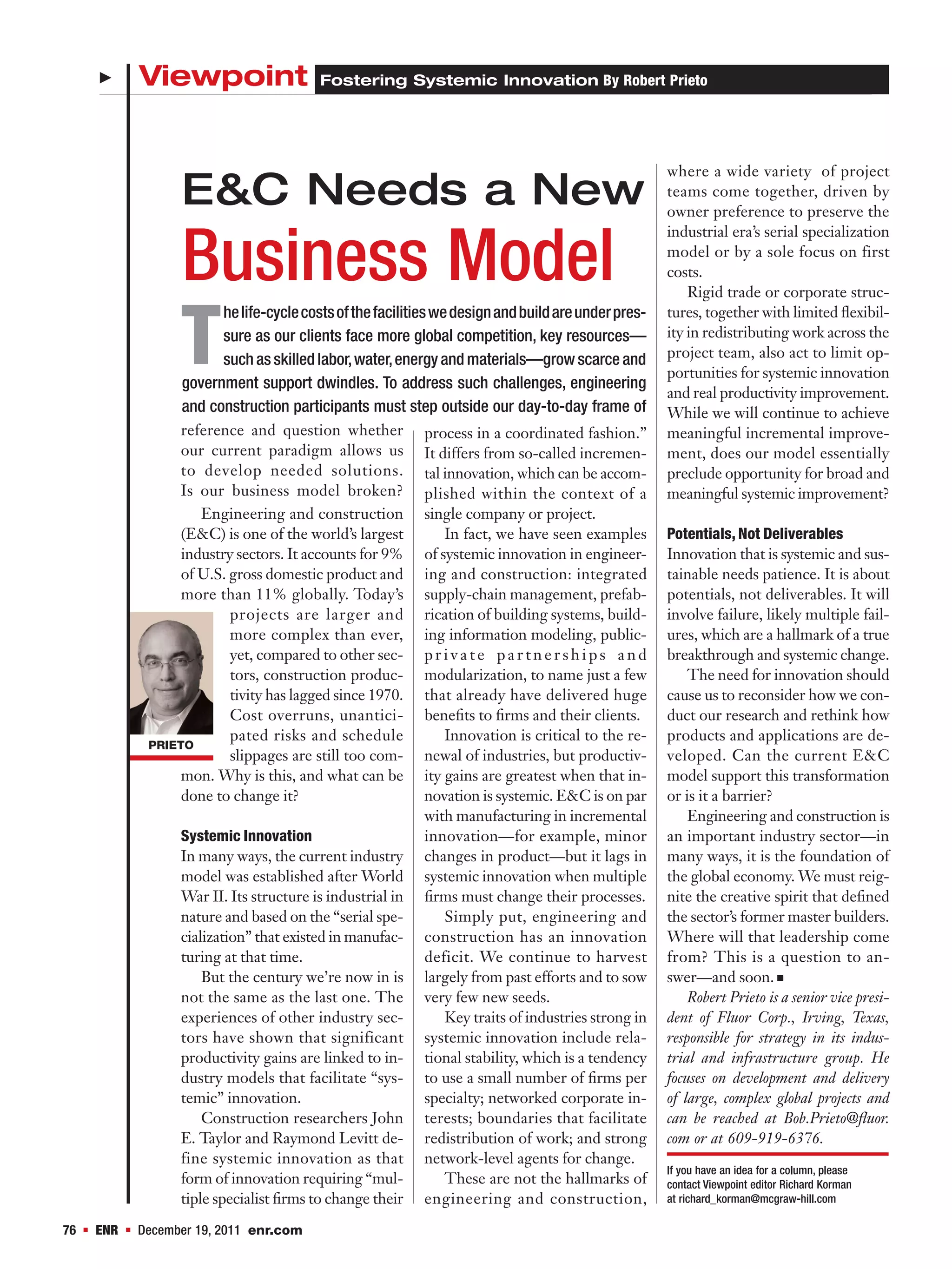 The document discusses the challenges and limitations within the engineering and construction (E&C) industry, highlighting the need for systemic innovation to address issues such as productivity lag and project complexities. It emphasizes that traditional models, rooted in serial specialization, may impede meaningful progress and questions whether these models are broken. The piece argues for a reevaluation of industry practices to foster collaboration and innovation, as seen in other sectors, to sustain growth and enhance competitiveness.