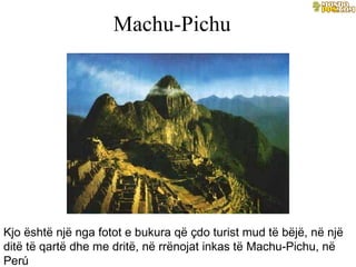 Machu-Pichu Kjo ështënjë nga fotot e bukura që çdo turist mud të bëjë, në një ditë të qartë dhe me dritë, në rrënojat inkas të Machu-Pichu, në Perú