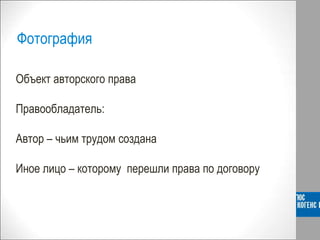 Документ обсуждает правовые аспекты использования фотографий, включая необходимость согласия изображенных граждан и исключения из этого правила. Также рассматриваются вопросы интеллектуальной собственности, включая авторские права и средства индивидуализации для юридических лиц. Приведен кейс о конфликте между несколькими компаниями, использующими одно и то же товарное наименование "бытаня".