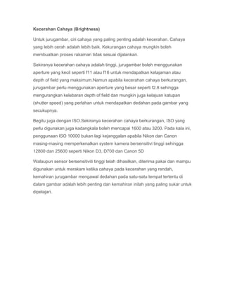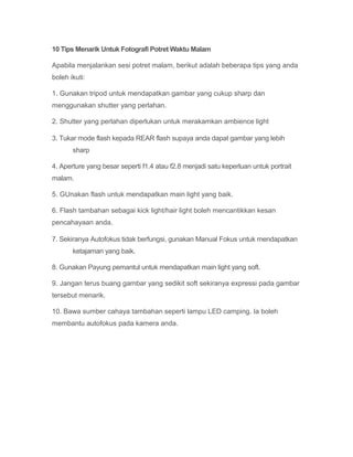 Artikel ini memberikan 10 tips untuk fotografi potret malam dan menjelaskan konsep-konsep dasar seperti aperture, shutter speed, ISO, depth of field, dan exposure. Topik lain yang dibahas adalah teknik panning, prioritas aperture dan shutter, serta panduan sunny 16 untuk mengatur exposure secara manual.