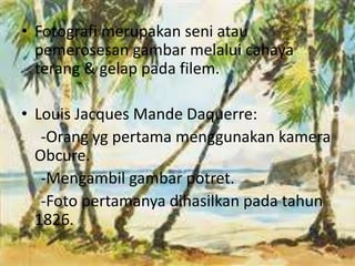 Fotografi adalah seni memproses gambar menggunakan cahaya yang melibatkan kamera dan filem yang sensitif terhadap cahaya. Louis Jacques Mandé Daguerre adalah pelopor fotografi yang menghasilkan potret pertamanya pada tahun 1826. Nilai estetik dalam fotografi bergantung kepada kreativiti jurugambar dan melibatkan elemen seperti subjek, komposisi, dan kandungan gambar.