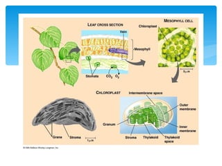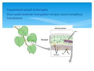 Fotosintesis adalah proses yang mengubah energi matahari menjadi energi kimia melalui kloroplas, melibatkan dua lintasan metabolik: reaksi terang dan siklus Calvin. Proses ini menghasilkan glukosa dan oksigen dari karbon dioksida dan air, serta melibatkan beberapa pigmen seperti klorofil. Tanaman C4 dan CAM memiliki adaptasi khusus untuk meningkatkan efisiensi fotosintesis dalam kondisi tertentu.