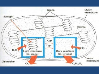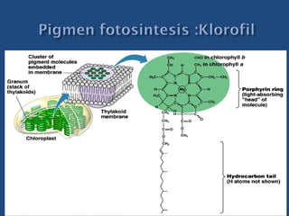 Dokumen ini menjelaskan proses fotosintesis pada tumbuhan hijau, termasuk peran kloroplas dan klorofil dalam menangkap energi matahari. Selain itu, dijelaskan juga tahap reaksi terang dan gelap serta faktor yang mempengaruhi fotosintesis. Pigmen seperti karotenoid berfungsi melindungi klorofil dan membantu menangkap cahaya.