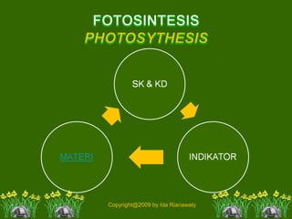 Dokumen tersebut membahas tentang proses fotosintesis pada tumbuhan hijau. Secara singkat, fotosintesis adalah proses dimana tumbuhan menggunakan energi cahaya matahari, karbon dioksida, dan air untuk menghasilkan glukosa dan oksigen. Proses ini terjadi di daun tumbuhan melalui kloroplas dan dipengaruhi oleh berbagai faktor internal maupun eksternal tumbuhan.
