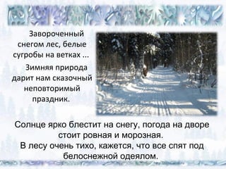 Документ описывает зимний лес, наполненный снежными пейзажами и атмосферой спокойствия. Природа создает чувственный праздник, где снег сверкает на солнце, а звуки птиц улетают в морозном воздухе. В этом волшебном окружении можно заметить следы животных, что добавляет ощущение жизни в мир тишины и красоты.