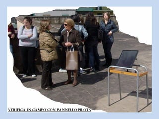 The document discusses the viability of installing a photovoltaic system at a school based on energy production, environmental impact, and financial considerations. It finds that a 19.8 kW photovoltaic system would be energetically and economically profitable for the school due to annual energy production of 1350 kWh per kW of panels and a payback period of 8-10 years. The environmental impact is also favorable as carbon dioxide emissions would be 22 times lower than a coal plant and the system's life cycle emissions are comparable to a biogas plant. A site investigation found the school roof could support installation of 110 panels in 3 rows facing south.
