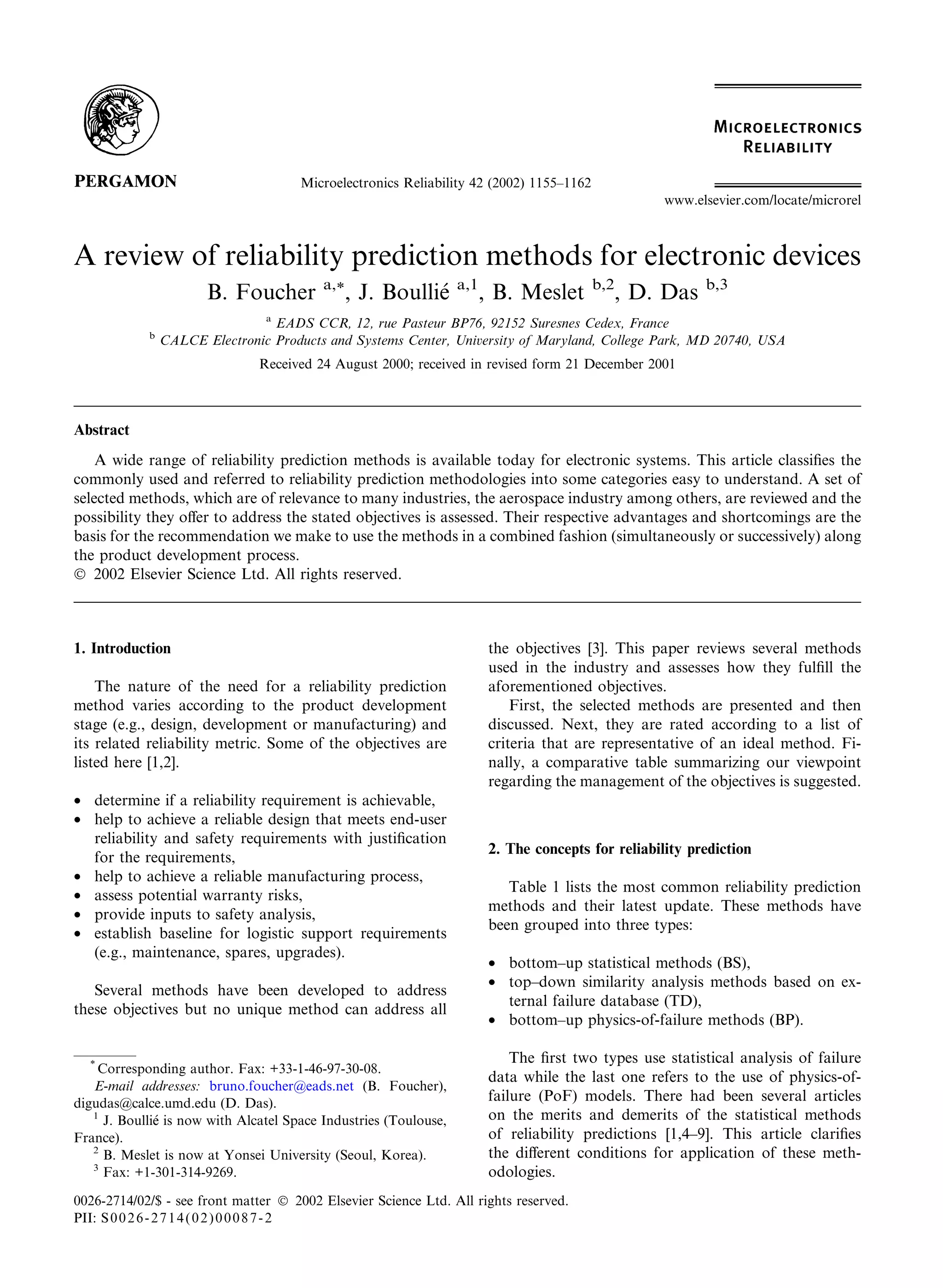 This document reviews reliability prediction methods for electronic devices. It classifies common methods into three categories: bottom-up statistical methods using failure data, top-down similarity analysis methods based on external failure databases, and bottom-up physics-of-failure methods. Several specific methods are described in detail, including how they calculate failure rates at the component and board level using statistical models or physical failure models. The methods each have advantages and limitations in addressing objectives like determining reliability requirements or providing inputs for safety analysis. A combined use of the methods is recommended to best manage reliability over the product development process.