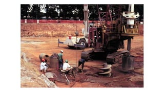 This document provides an overview of foundations for building construction. It discusses the importance of foundations in distributing building loads to the ground. There are two main types of foundations - shallow foundations and deep foundations. Shallow foundations include spread footings, grillage foundations, raft foundations, stepped foundations, and mat/slab foundations. Deep foundations transfer loads deep into the earth and include drilled caissons, driven piles, and precast concrete piles. Foundation design considers factors like soil type, structural requirements, construction requirements, site conditions, and cost. The document also discusses waterproofing, drainage, and underpinning foundations.