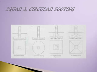 This document discusses foundations for buildings. It defines a foundation as the lowest supporting layer that transfers structural loads safely into the ground. Foundations increase stability by taking the structure deep into the ground. They are generally made of materials like brick, stone, or concrete. Foundations are designed based on soil type, site conditions, construction type, and economic factors. Foundations are categorized as either shallow or deep. Shallow foundations include footings that support columns directly on soil, while deep foundations transfer loads through weak soil using piles. Common shallow footing types are isolated, combined, continuous, strap, grillage, and raft foundations.