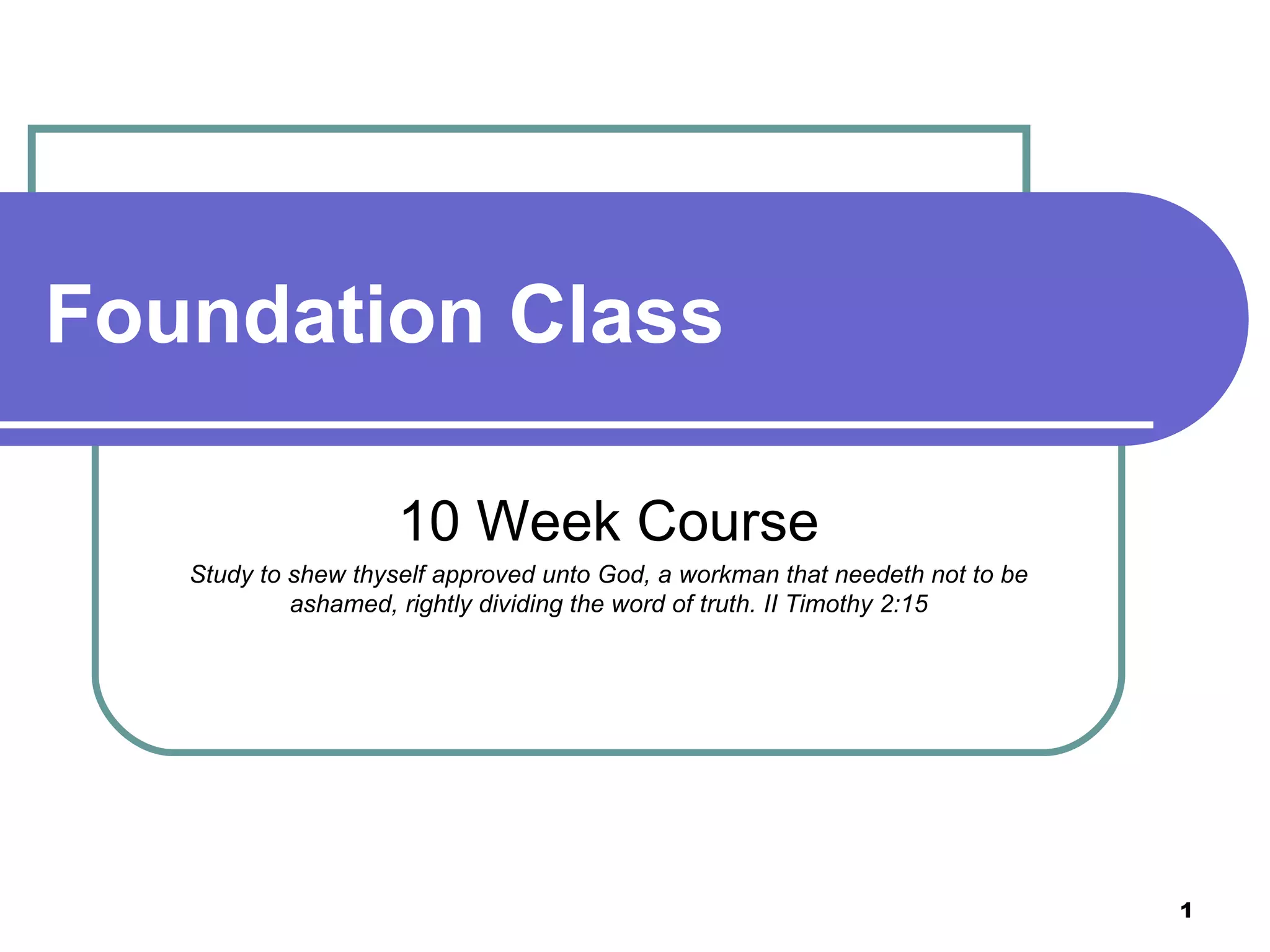 The document provides an overview of a 10-week foundation class course covering topics about the Christian faith. The schedule lists the dates, topics, and teachers for each class, including discussions on the new birth, the Godhead, the word, discipleship, prayer and fasting, and the second coming. The first class focuses on the new birth and being born again in Christ, contrasting mankind's state before and after accepting Christ.