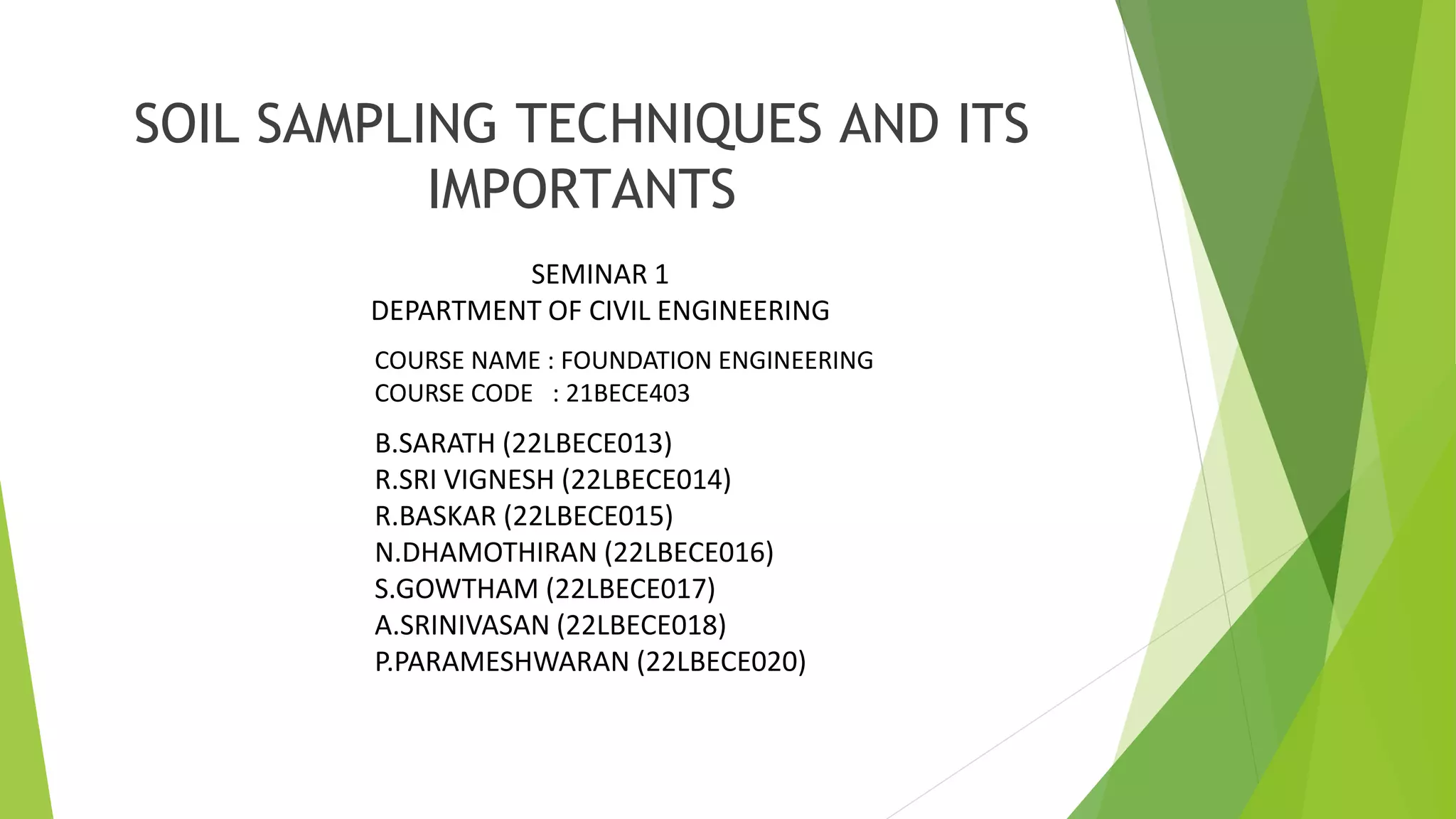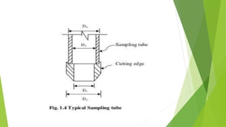 - There are different types of soil samples and sampling techniques that can be used depending on whether an undisturbed or disturbed sample is needed. Factors like sampling depth, tools, and procedure must be considered.