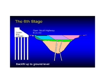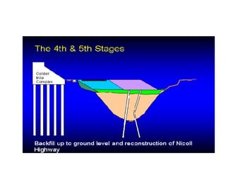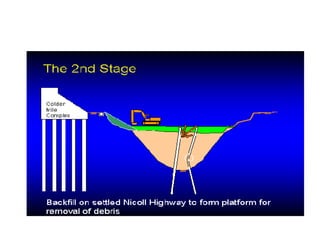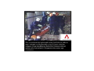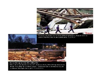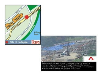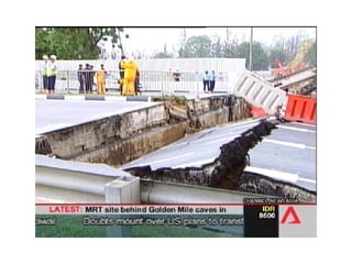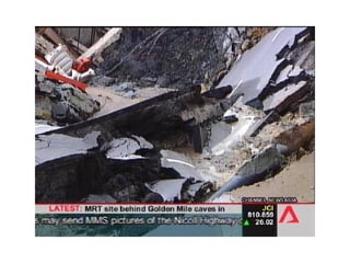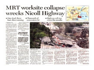 The document describes two structural failures: the 1995 collapse of the Sampoong Department Store in South Korea and the 2004 Nicoll Highway incident in Singapore. The Sampoong collapse was caused by overloaded floors and weakened support columns, trapping over 1,500 people and killing 500. The Nicoll Highway incident involved the collapse of an excavation site for an MRT tunnel, caving in a highway and killing 4 workers. Recovery efforts like stabilizing the soil and monitoring nearby structures were undertaken. Learning points on construction methods and their risks were discussed.