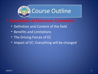 This document provides an overview of electronic commerce (EC), including definitions, applications, classifications, and the interdisciplinary nature of the field. EC is defined as the process of buying and selling or exchanging products, services, and information via computer networks and the internet. It discusses different types of EC like business-to-business (B2B), business-to-consumer (B2C), and consumer-to-consumer (C2C). The document also outlines the benefits and limitations of EC.