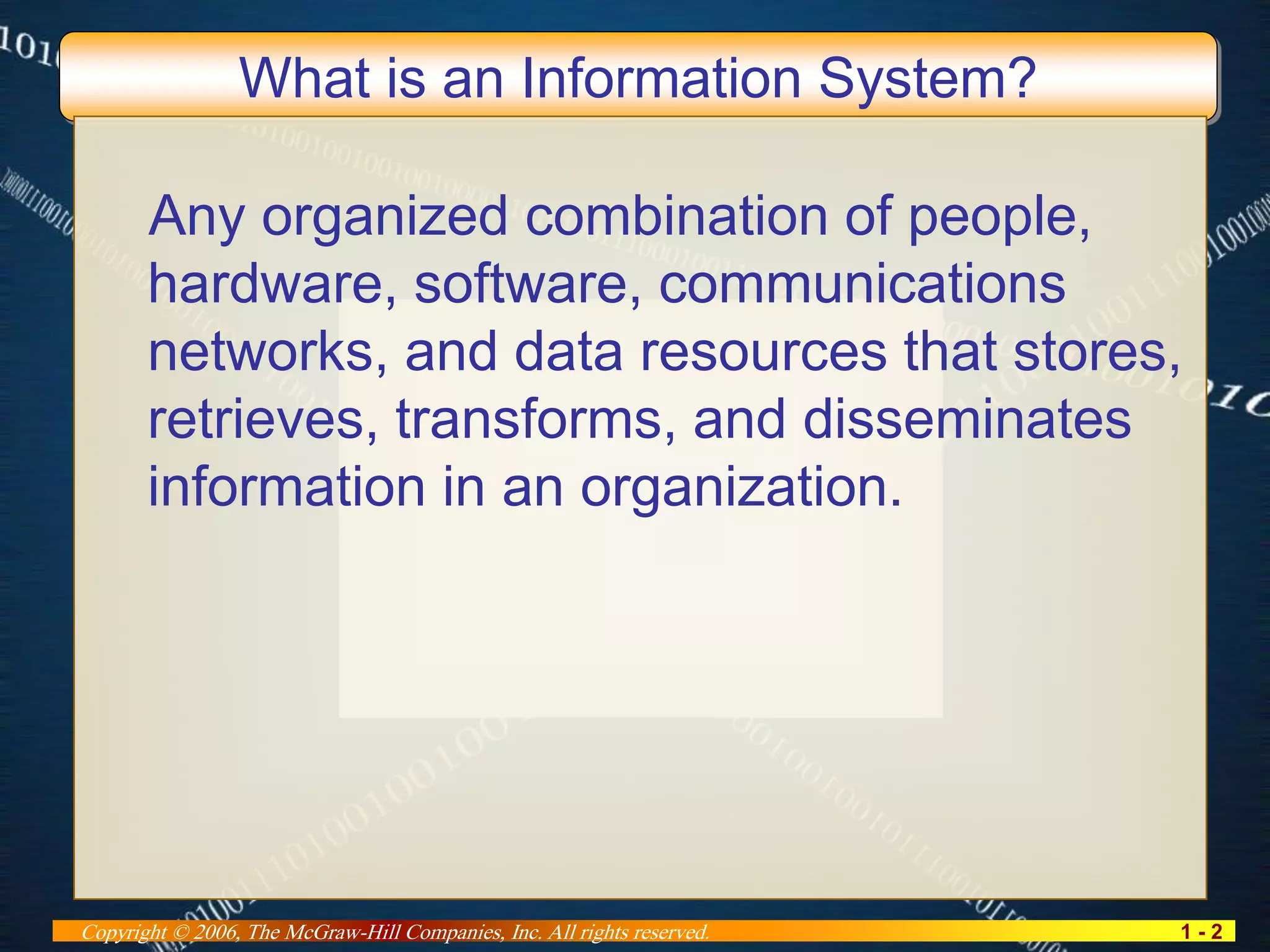 The document provides an overview of information systems (IS) in business, defining IS as organized combinations of people, hardware, software, communications networks, and data that manage information within organizations. It describes various types of information systems, including operational support systems and management support systems, highlighting their roles in processing transactions and aiding decision-making. Additionally, it discusses system components such as input, processing, output, and the distinction between data and information.