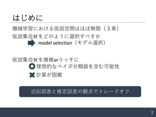 algorithm 正則化ベースアルゴリズム 仮説の複雑さに対して罰則を与えるアルゴリズム 例: SRM 43 Regularization based algorithmとは 以下を満たす無限仮説空間ℋ𝛾が与えられた時, ℋ:全ての線形関数の集合 SRM法を無限仮説空間に拡張し,以下のようにℎを選択