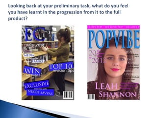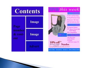 The document outlines the key elements and design of a magazine, including the masthead, cover lines, page numbers, headings, pull quotes, interviews, advertisements, and sections on music, celebrities, and competitions that appeal to its target 16-25 year old female and male readership across 15 countries. It also provides tips on photography skills, the magazine's consistent house style, and recommendations to maintain its success while improving the contents page layout and variety of artists featured.
