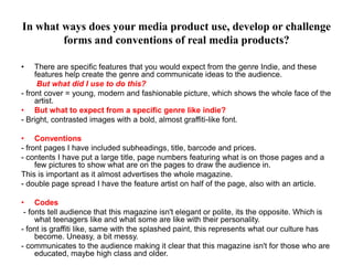 This document contains Jennie Baxandall's evaluation of her media magazine "Exposure". She summarizes how she used conventions of the indie genre in her magazine through fonts, images, and layout. She represents teenagers aged 16-20 by including trendy fashion, popular music, and casual language. Her target media institution would be magazines like NME or Kerrang that distribute rock music magazines. She learned important skills in Photoshop, camera usage, and magazine design through constructing this project.