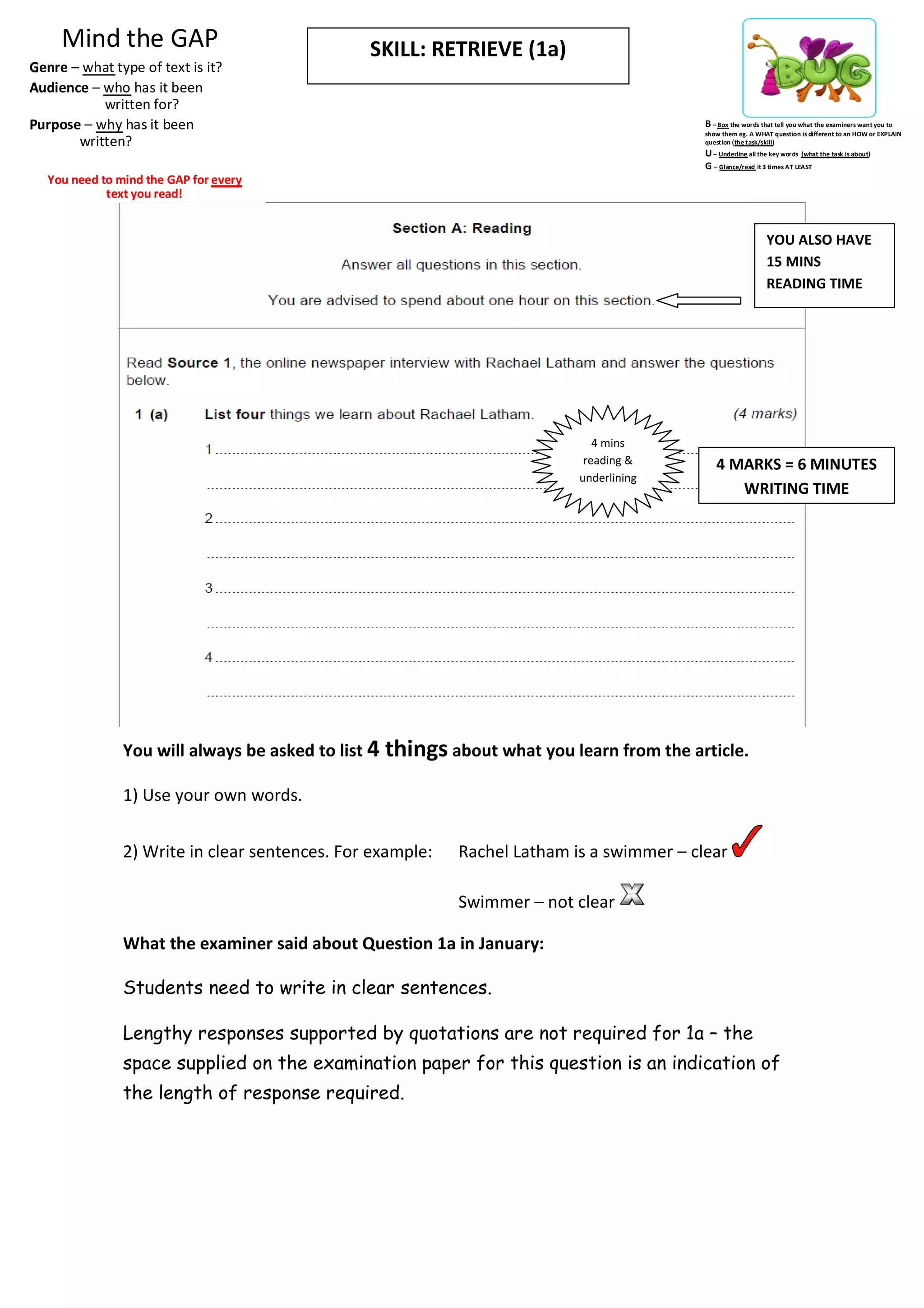 This document provides guidance on how to answer different types of exam questions. It begins by explaining the importance of identifying the genre, audience, and purpose of any text. It then provides tips for questions that require retrieving information, making inferences, comparing presentational features, and explaining, describing, persuading or arguing. The document emphasizes planning, using evidence from the text, making links to the question, and crafting well-structured writing. It advises treating the examiner's time seriously and crafting responses to engage and sustain their interest.