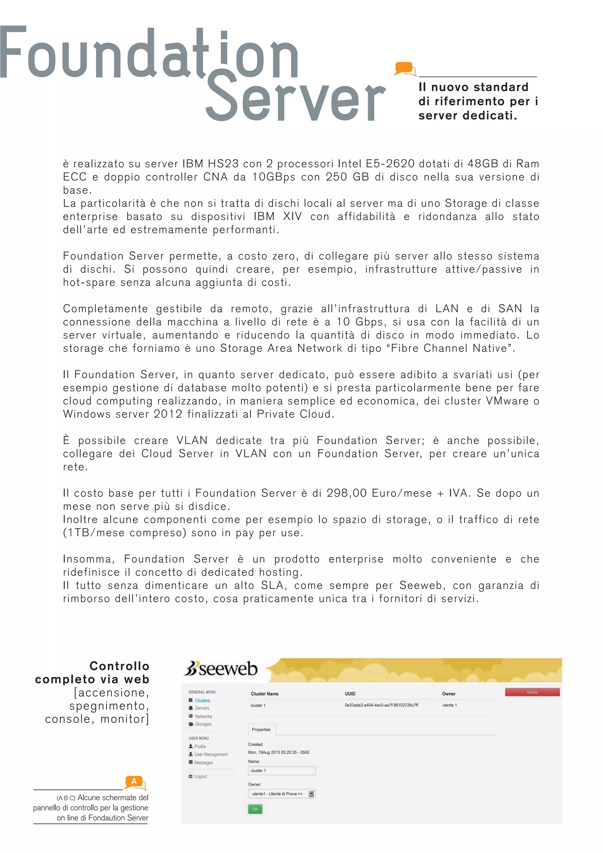 Il documento descrive il nuovo prodotto 'foundation server', un sistema server dedicato basato su tecnologia IBM, progettato per offrire storage di alta affidabilità e permette la gestione remota. Supporta l'attivazione di più server con storage condiviso a basso costo e facilità d'uso, ideale per cloud computing e clustering. Offre anche un alto livello di garanzia di servizio e policy pay-per-use per componenti aggiuntive.