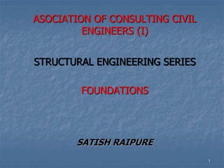 This document provides an overview of structural foundations and related topics. It discusses the importance of structural design and geotechnical investigations. The main types of foundations are described, including shallow foundations like isolated, combined and strip footings, as well as deep foundations like piles. Load combinations, design methods, and reinforcement detailing are also covered. The document emphasizes the importance of proper foundation design and highlights potential problems to avoid in excavation and construction.