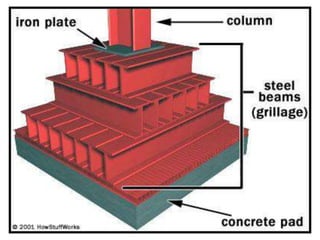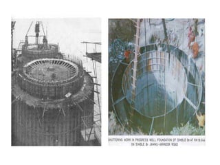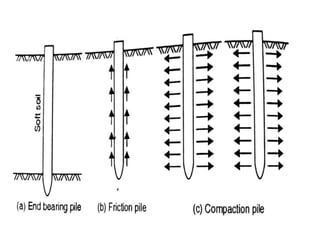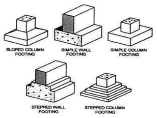 This document discusses different types of foundations, including shallow and deep foundations. Shallow foundations include spread footings, combined footings, strap footings, and raft/mat foundations. Deep foundations include pile foundations, pier foundations, and caisson/well foundations. It also discusses considerations for foundations on expansive black cotton soil, recommending methods like strip foundations, pier foundations, and under-reamed pile foundations.