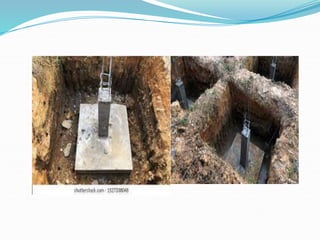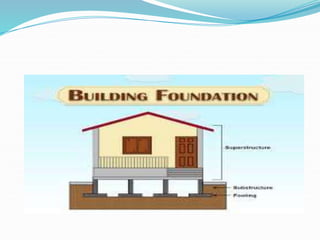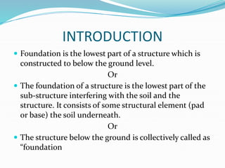 This document discusses foundations for structures. It defines foundations as the lowest part of a structure that transfers loads to the soil below ground level. Foundation engineering involves evaluating soil bearing capacity and determining the proper type, size, and depth of footings. The purpose of foundations is to transfer structural loads to the underlying soil without causing failure or excessive settlement. Shallow foundations spread loads laterally near the surface, while deep foundations distribute loads vertically to deeper soil layers using piles, piers or caissons when the upper soil cannot support the loads. Different types of shallow and deep foundations are described, along with their uses in different soil and load conditions.