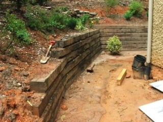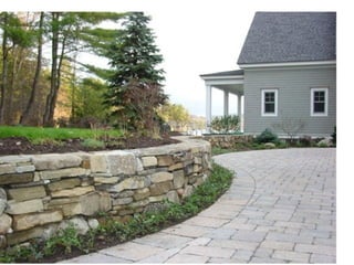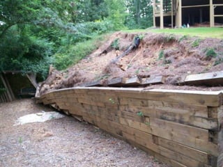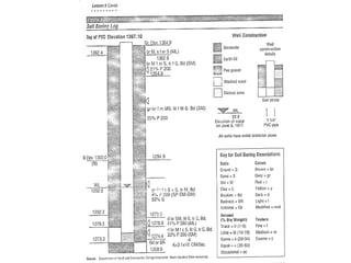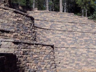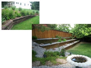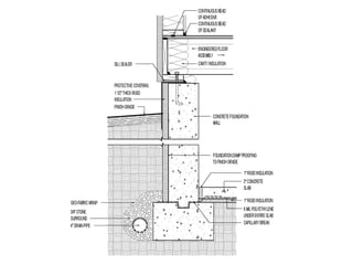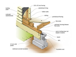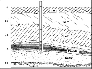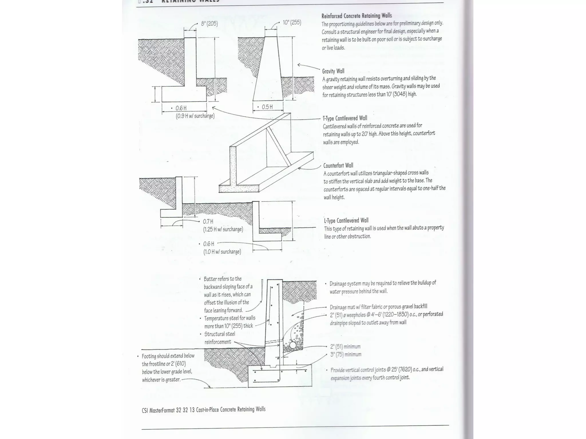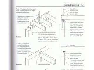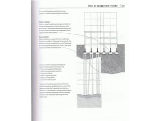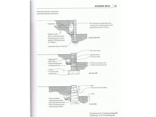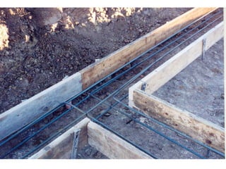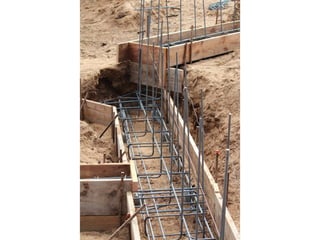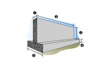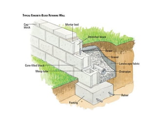 The document discusses the construction of a retaining wall with a poured concrete foundation. Soil borings are done first to understand the soil composition. Wood formwork is used to build the concrete footing, and rebar is placed inside for reinforcement before pouring the concrete. The fresh concrete is poured into the formwork to create the new footing, which vertical rebar will connect to the retaining wall for additional support and stability.