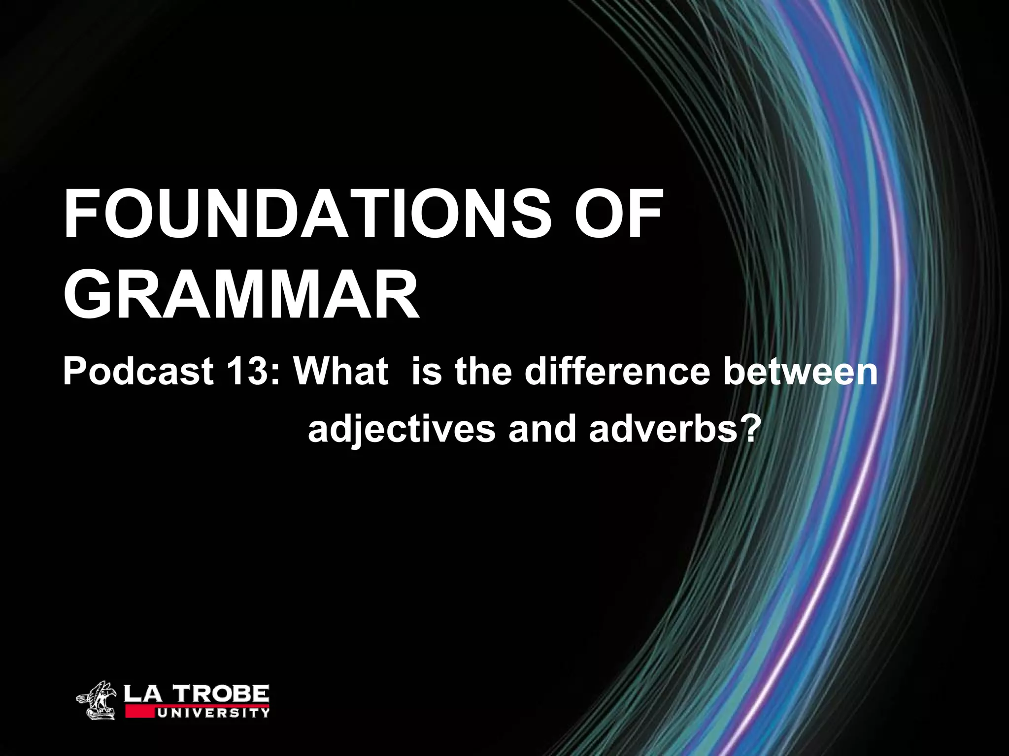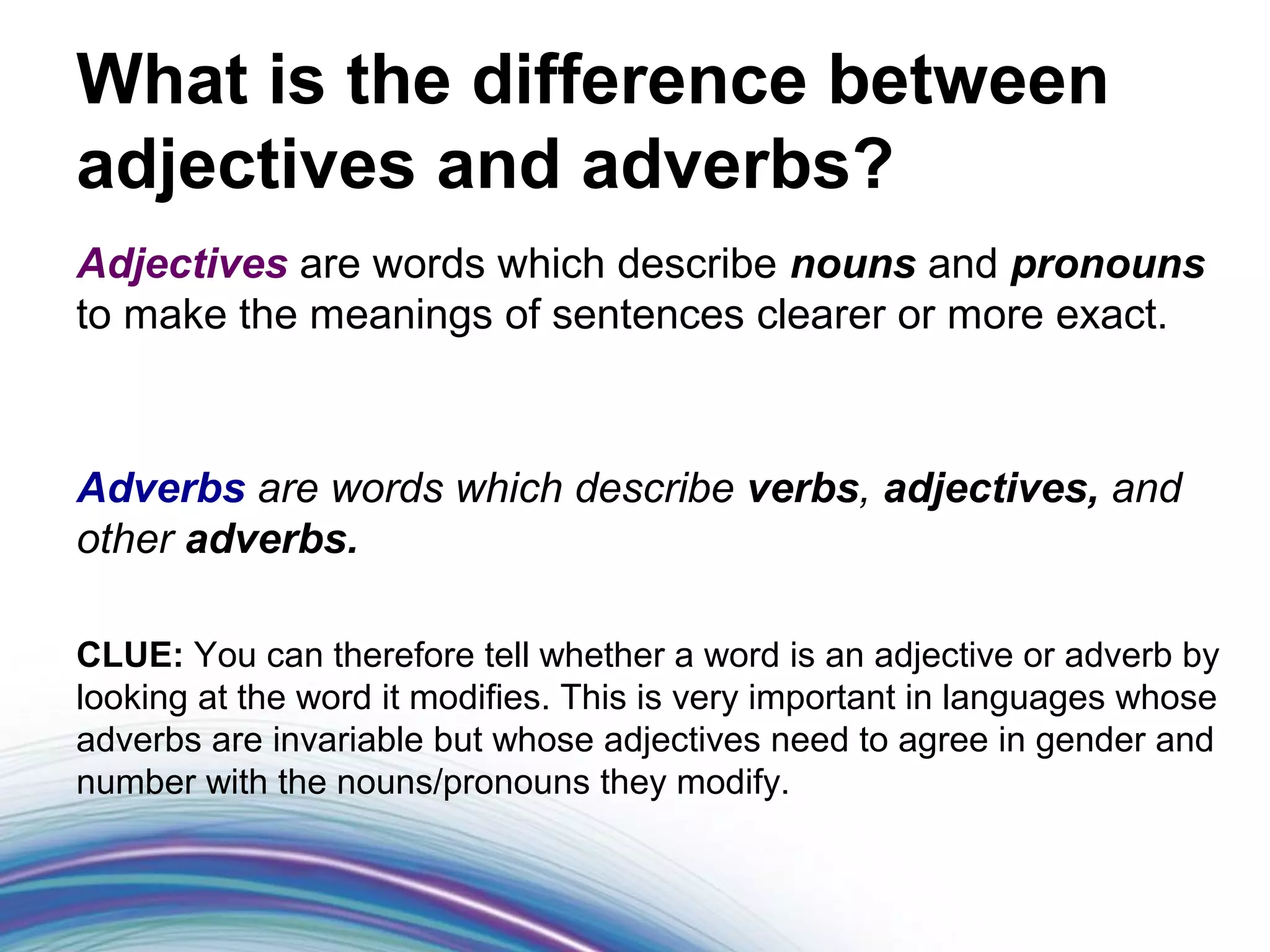 Adjectives describe nouns and pronouns to make their meanings more clear or exact, while adverbs describe verbs, adjectives, and other adverbs. The key difference is that adjectives modify nouns and pronouns, while adverbs modify verbs, adjectives, and other adverbs. Examples are provided to illustrate adjectives describing nouns like "classical music" and adverbs describing verbs like "sing softly." Care must be taken to use adjectives and adverbs correctly in sentences.