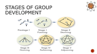 This document provides an overview of group dynamics and types of groups. It discusses formal and informal groups, as well as small and large groups. Formal groups are formed by the organization to carry out tasks, while informal groups are formed spontaneously by employees. Small groups allow for face-to-face interaction, while large groups do not allow for personal interaction. The document also discusses theories of group formation, norms, roles, and processes within groups.