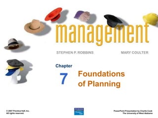 This document discusses planning in organizations. It defines planning as a primary managerial activity that involves setting goals, strategies, and plans. Planning can be formal or informal. Formal planning is associated with higher performance but quality of planning matters more than extent. Planning provides direction, reduces uncertainty, minimizes waste, and sets standards for control. Goals and plans are key elements of planning. Different types of goals and plans are discussed. Traditional top-down goal setting can lose clarity while involving members across levels maintains focus. Contingency factors like environment and manager level affect planning approaches.