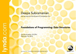 Deepa Subramanian earned a Certificate of Completion for the course "Foundations of Programming: Data Structures" on February 16, 2016. The course duration was 2 hours and 29 minutes and the certificate number is 72413495631E4DD5BFF8C6E99616201F.