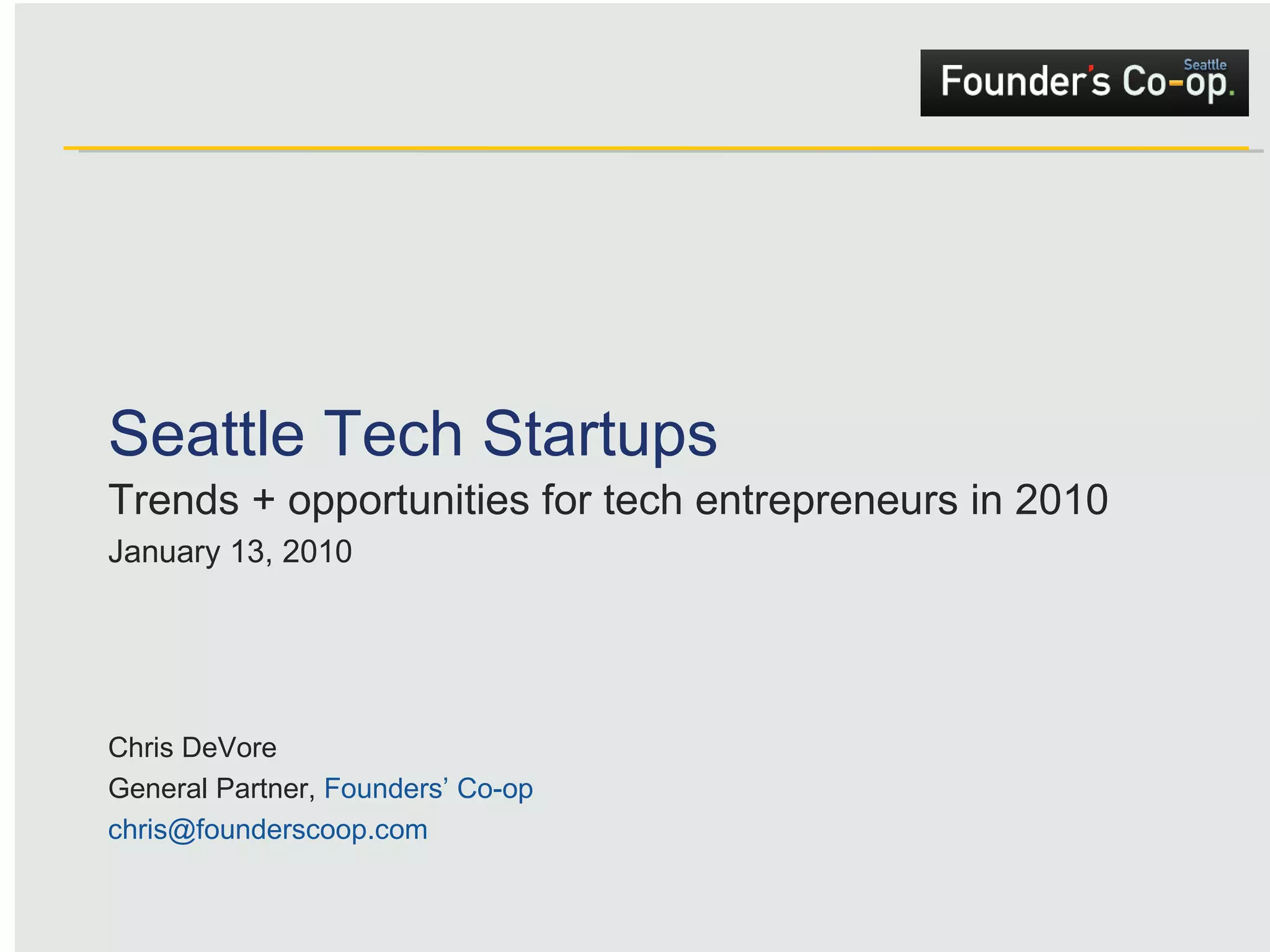 The document outlines insights on Seattle tech startup trends and opportunities for entrepreneurs in 2010, presented by Chris Devore from Founders' Co-op. It discusses the limited availability of funds for early-stage ventures, highlights three main themes for investment - customer acquisition, mobile web, and business intelligence/workflow - and emphasizes the importance of capital efficiency and community support. Founders' Co-op aims to back innovative entrepreneurs with smaller investments and a strong focus on engineer-led teams.