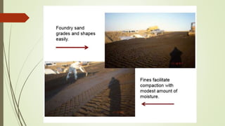 Foundry sand is a high-quality silica sand used to make molds for metal casting. It typically contains silica sand, bentonite clay, water, and coal. Approximately 9-10 million tons of foundry sand is discarded each year. Some discarded foundry sand can be reused in construction after testing shows metals and chemicals meet environmental thresholds. Using foundry sand in construction has advantages like reducing costs and waste compared to using only virgin materials. It can be used in highway bases and embankments if designed correctly.