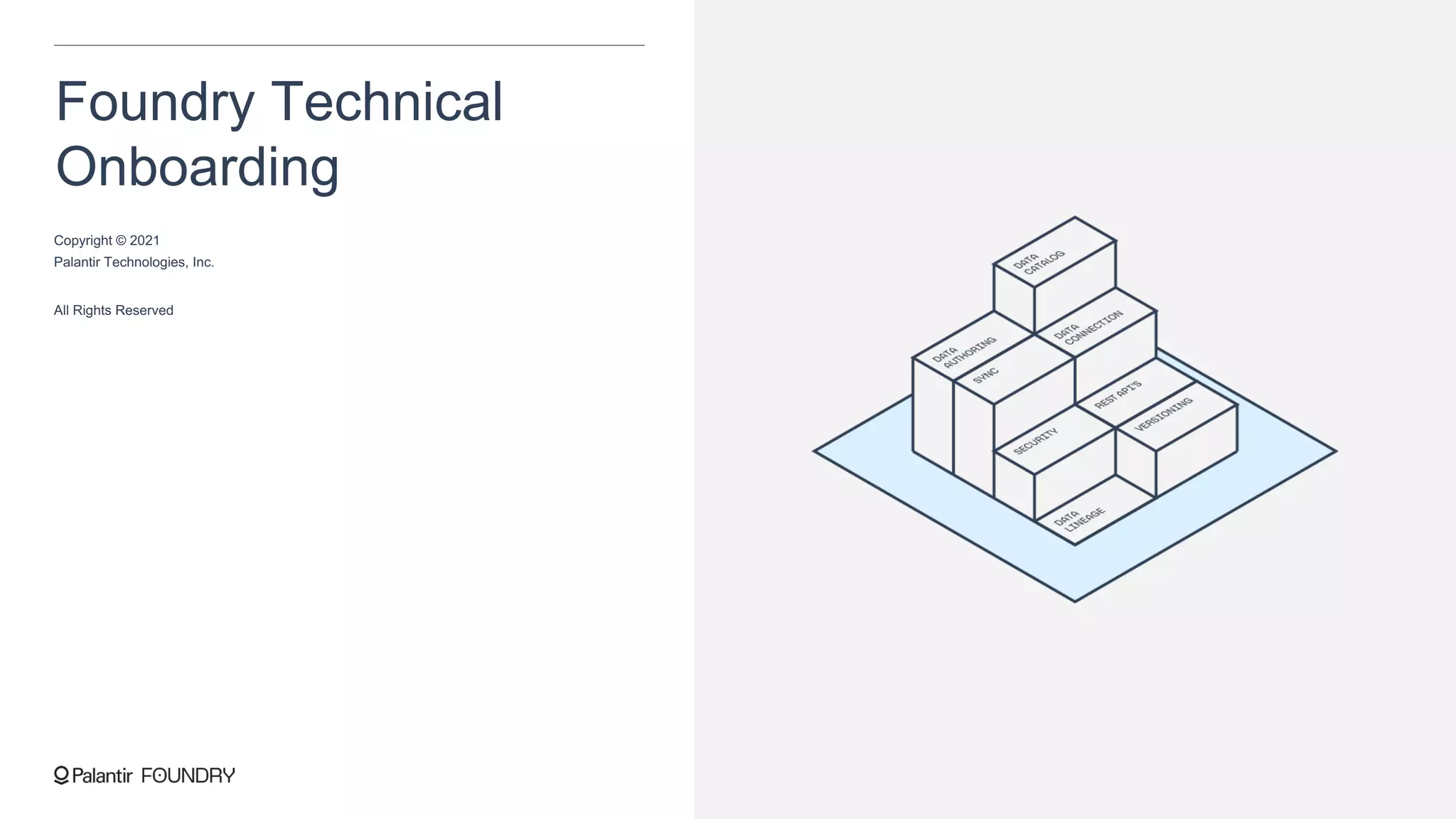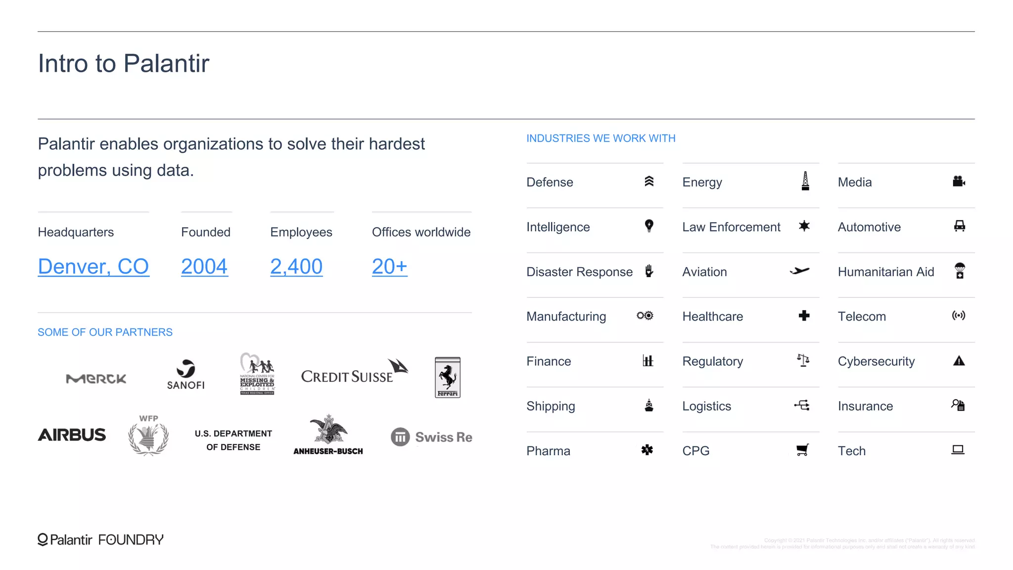 Palantir provides an overview of its Foundry platform, which enables organizations to solve problems using data. The document outlines the six steps to sign up for Foundry: 1) selecting a region, 2) selecting a domain, 3) configuring the data connector, 4) setting up single sign-on, 5) sharing user country locations, and 6) reviewing security assessments. It also provides details on Foundry's security features, connectivity options, and the ability to use an on-premise appliance.