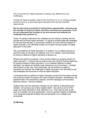 This document outlines four mistakes that leaders in higher education are making in dealing with changes confronting universities. The mistakes are: (1) whining about decreased funding rather than focusing on partnerships; (2) threatening privatization instead of recognizing funding model shifts; (3) focusing only on elite students rather than increasing access and diversity; and (4) separating access and success goals. The document argues higher education must address challenges through new strategies, lower costs, and serving the public good.