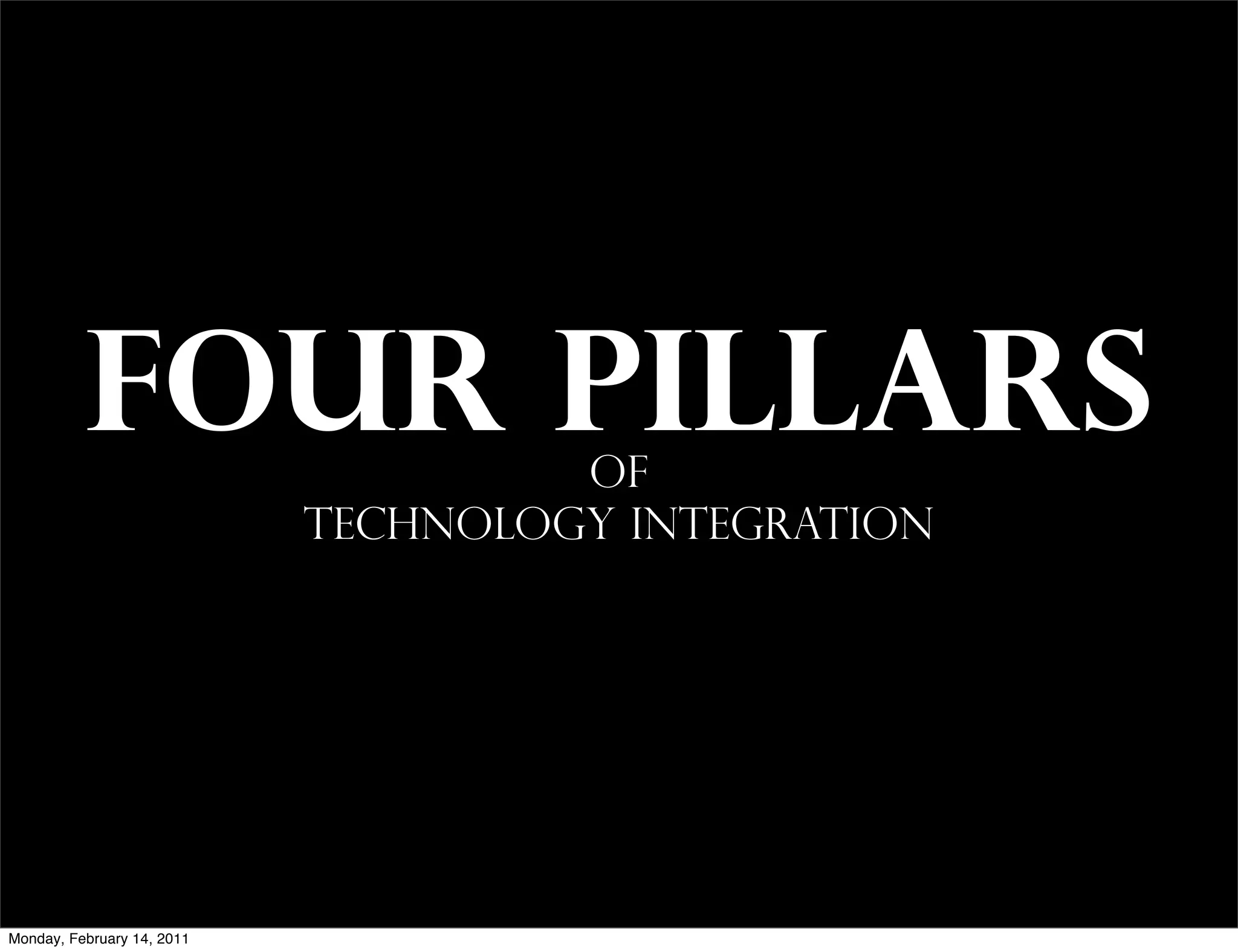 The document discusses a presentation about the four pillars of technology integration. The presentation aims to provide one vision for how technology can transform education, examples of a school's technology strategies, and discussions on each of the four pillars with suggestions for taking action. Participants will provide concluding feedback using a shared Google doc.