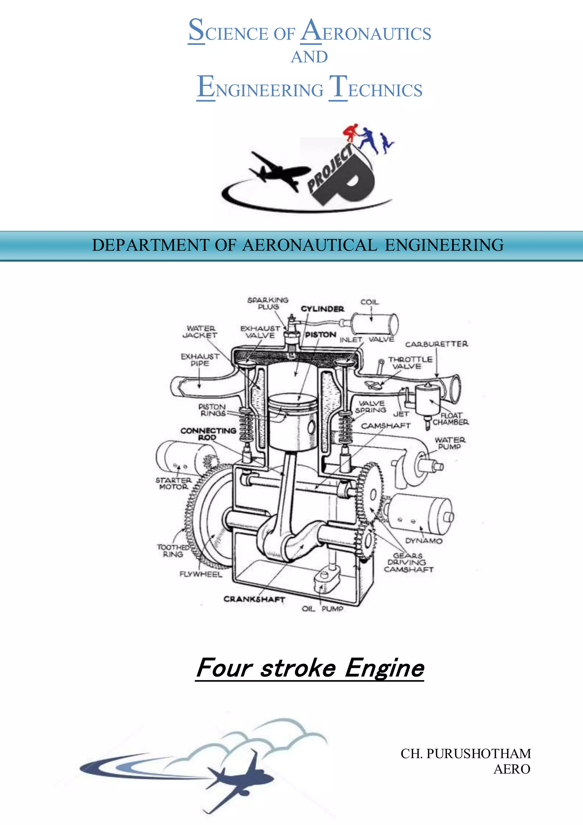 The document discusses the four-stroke engine cycle and its key components. It describes the four strokes of intake, compression, power, and exhaust. It then lists and describes the main engine parts, including the cylinder block, pistons and piston rings, spark plug, valves, connecting rod and crankshaft, injector, camshaft, and sump. The core function of these parts is to intake air and fuel, compress it, ignite it to create power, and exhaust spent gases in the four-stroke cycle.