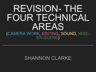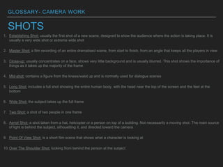 This document defines key technical terms related to four areas of filmmaking: camera work, editing, sound, and mise-en-scene. It provides definitions for various shots, angles, movements, cuts, transitions, sound elements, and aspects of production design. Terms defined include establishing shot, close-up, pan, dissolve, diegetic sound, soundtrack, set design, lighting, and more. The glossary offers concise explanations of essential cinematic techniques.