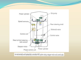 The document discusses steering systems in vehicles, focusing on the types, particularly four-wheel steering (4WS), which enhances maneuverability and vehicle stability. 4WS allows for tighter turning radii at low speeds and increased stability at high speeds, boasting a significant reduction in turning radius compared to traditional two-wheel steering. The conclusion highlights the potential for widespread adoption of 4WS, which, despite high initial costs, promises improved efficiency and functionality in vehicle handling.