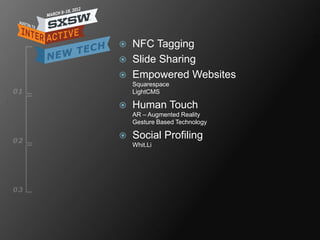 The document discusses emerging technologies in retail and their applications. Near field communication (NFC) allows sharing product information by tapping phones. Websites like Squarespace and LightCMS make creating and updating sites easy. Augmented reality and gesture recognition are enhancing the shopping experience. Social media is used for profiling customers and generating leads for B2B. Mobile devices are empowering retail staff and providing real-time inventory access.