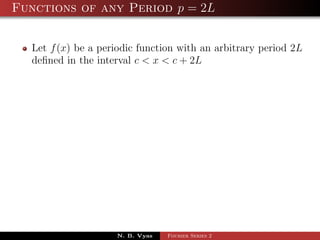 The document discusses the Fourier series representation of periodic functions with an arbitrary period. It provides the general form of the Fourier series for a function f(x) with period 2L, defined over the interval c < x < c + 2L. It also gives the specific forms when c = 0, -L, or L. An example of finding the Fourier series of the function f(x) = x^2 from 0 to 2 is worked out step-by-step.
