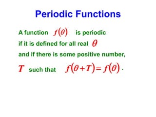 This document discusses periodic functions and Fourier series. A periodic function repeats its values over regular intervals called periods. The Fourier series represents periodic functions as the sum of trigonometric functions (sines and cosines) with different frequencies. The document derives the formulas to calculate the coefficients of the Fourier series from a given periodic function. It involves integrating the function multiplied by sines and cosines over one period of the function.