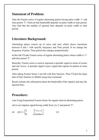 1. The document discusses taking the Fourier series of regular alternating pulses with pulse width τ and time period T to analyze how bandwidth and number of spectral lines depend on these parameters.