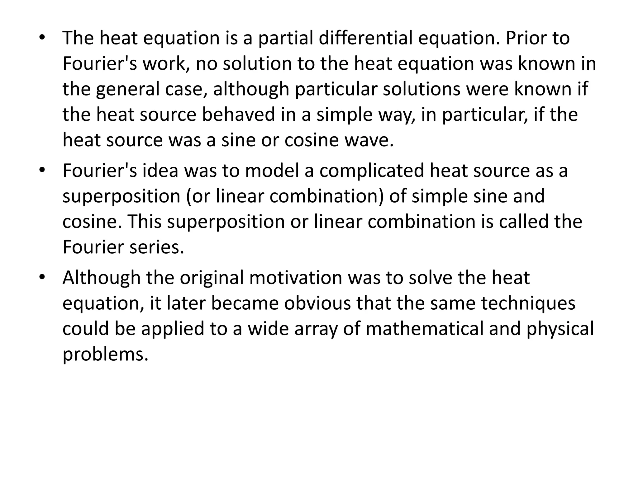 - Prior to Fourier's work, there was no known solution to the heat equation in the general case. Fourier's idea was to model a complicated heat source as a superposition of simple sine and cosine waves.