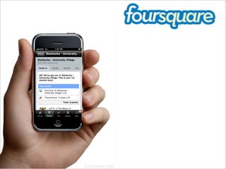 Foursquare is a location-based social networking service that allows users to check-in at locations and earn points/badges. The document discusses Foursquare's features, partnerships, funding, and past promotional campaigns with brands like Zagat and Warner Bros. It then proposes a new promotional campaign called "The City is Your Playground" to increase members through a sweepstakes where users earn clues to check-in at 10 venues across cities to win the "Governor" badge. The campaign aims to boost awareness, referrals, and partnerships through competitive gaming.