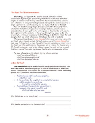 The document discusses the Fourth Commandment to remember the Sabbath day and keep it holy. It provides context that the first three commandments deal with relationships with God, while the remainder deal with relationships between people. The Fourth Commandment bridges these, as it was revolutionary in requiring a day of rest for all people, including servants, freeing them from constant labor. The basis for the commandment is that God rested on the seventh day after creating the world in six days. The Sabbath was meant to be a day of physical, psychological, emotional and spiritual renewal through rest and focusing on God, rather than secular pursuits or work.